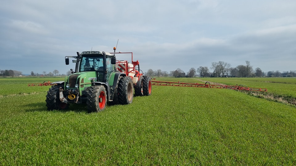 Die erste landwirtschaftliche Tätigkeit in diesem Jahr. Viel zu spät haben wir wegen der extremen Nässe die Triticale gegen Gras und Kamille behandeln können.